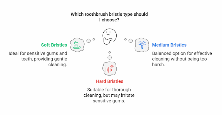 | Toothbrush Bristle Types | Soft Bristles: Recommended by dentists, gentle on sensitive gums/enamel, effective at cleaning plaque without damage. Medium Bristles: More scrubbing power, but can be harsh on gums and enamel if used forcefully. Hard Bristles: Not recommended; may cause gum irritation and enamel wear, leading to sensitivity. |